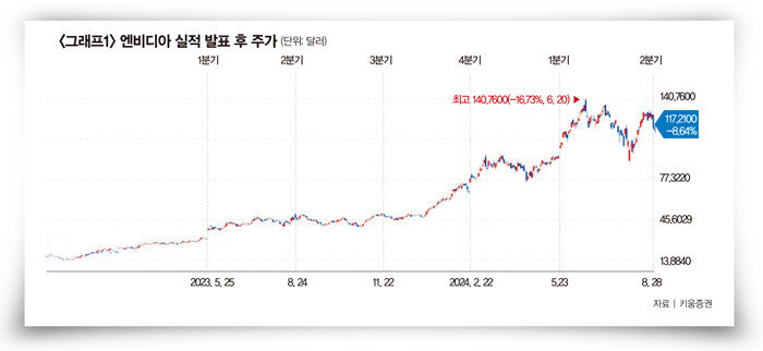 엔비디아 2분기 자체 매출 예상치인 280억 달러(약 37조3520억 원)는 물론, 시장 예상치인 287억 달러도 웃도는 수치다. 하지만 최근 3개 분기 연속 200%대 성장률을 보인 것과 비교하면 크게 떨어진 수치에 시장은 실망했다. 이번 실적 발표를 통해 차세대 인공지능(AI) 칩 ‘블랙웰’의 출하 시점이 공식적으로 연기된 점도 실망감을 키웠다. 이에 엔비디아 성장이 둔화된 것 아니냐는 우려가 쏟아지며 주가가 시간외거래에서 8% 이상 급락했다(그래프1 참조).