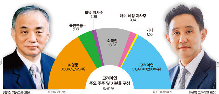 영풍그룹은 독특한 지분 구조를 가진 기업이다. 외형적으로 고려아연은 최 씨 일가가, 전자 계열사는 장 씨 일가가 맡는 분리 경영을 해왔지만 영풍그룹 계열사를 자세히 들여다보면 소유와 경영이 분리된 곳이 많다. 1974년 설립된 고려아연도 그런 경우다. 최대주주는 장 씨 일가 소유의 영풍(25.4%)이지만 경영은 최 씨 일가 3세 최윤범 회장이 맡고 있다. 영풍이 “(고려아연에 대해) 고작 2.2% 지분을 가진 경영 대리인인 최 회장이 75년 동업자 정신을 훼손하고, 고려아연을 사유화하고자 전횡을 일삼고 있다”고 주장하는 이유다.