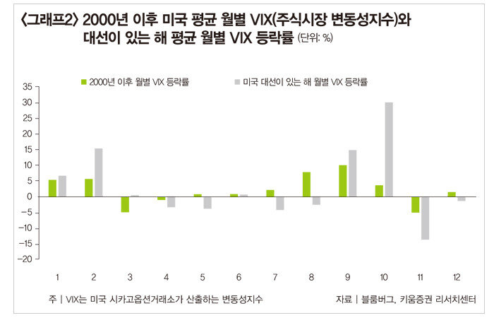 특히 도널드 트럼프 공화당 후보의 지지율이 상승할수록 시장의 고민은 깊어질 것이다. 블룸버그 서베이에서도 “트럼프 당선 시 연준의 독립성이 저해되거나 해리스가 당선했을 때보다 내년까지 기준금리가 더 높아질 것”이라는 의견이 우세한 것으로 나타났다. 역사적으로 미국 대선이 있는 해 10월에는 증시 변동성이 높았던 만큼 올해 10월에도 매크로 이슈보다 미국발(發) 정치 이슈가 시장의 중심에 놓일 것으로 전망된다(그래프2 참조).