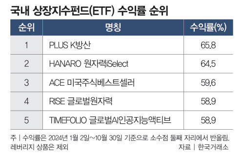염승환 LS증권 이사가 10월 28일 “K-방산은 한국 특산품”이라며 이같이 말했다. 염 이사의 설명처럼 최근 한국 증시가 부진의 늪에 빠진 와중에도 방산주와 바이오주는 약진하고 있다. 국내 주요 방산기업으로 구성된 ‘PLUS K방산’ 상장지수펀드(ETF)는 10월 30일 기준 연초 대비 65.8% 상승하며 전체 ETF 수익률 순위 1위를 차지했다(표 참조). 같은 기간 코스피가 2.3% 하락한 것과 대비된다. 바이오주 역시 같은 기간 알테오젠(284.8%), 펩트론(118.6%), 삼성바이오로직스(35.7%) 등을 필두로 상승세를 이어가고 있다. 이날 염 이사는 “너무나 답답한 시기지만 절대 포기하지 마라”며 “시장에 붙어 있어야 기회를 포착할 수 있다”고 말했다. 다음은 염 이사와 나눈 일문일답.