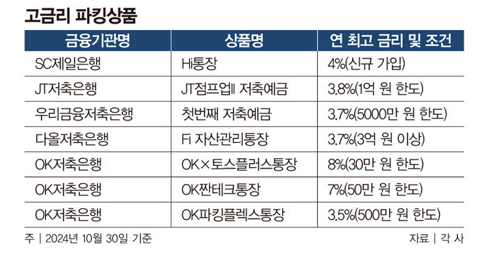 파킹통장은 요구불예금의 하나로 짧은 기간 돈을 넣어두고 언제든지 찾을 수 있는 통장이다. 만기를 채우지 못하면 중도해지에 따른 손실이 발생하는 정기예금과 달리 맡긴 기간만큼 쏠쏠한 이자를 받으면서 언제든 돈을 넣고 뺄 수 있어 고객에게 유리하다. 파킹통장은 일반적으로 예치금액에 따라 금리가 차등 적용되며, 소액 구간 이자율이 더 높은 경향이 있다. 현재 시중은행에서는 SC제일은행의 ‘Hi통장’이, 저축은행에서는 OK저축은행의 ‘OK×토스플러스통장’이 가장 높은 이자를 주는 상품으로 인기를 모으고 있다(표 참조).