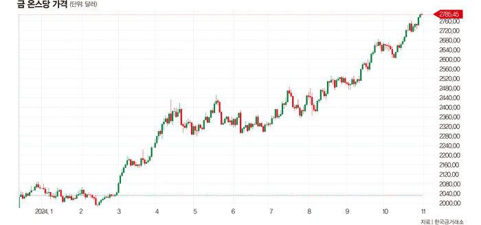 최근 국제 금값은 세계 정치·지정학적 불확실성과 신흥국 중앙은행의 금 매입 수요 등을 발판 삼아 상승 랠리를 이어갔다. 전문가들은 세계 각국 분쟁에 따른 지정학적 위기와 미국 대선 이후 정치·경제적 불확실성에 대응하려는 수요가 금 인기를 견인했다고 설명한다.