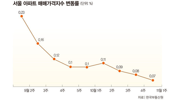서울 아파트 시장 숨 고르기는 통계에서도 확인된다. 서울 아파트 매매가격이 33주 연속 상승했으나 오름폭은 3주째 줄어들었다. 한국부동산원에 따르면 11월 첫째 주(4일 기준) 서울 아파트 매매가격은 0.07% 상승했다(그래프 참조). 9월 둘째 주(0.23%) 이후 4주 연속 상승폭이 줄어들다가 10월 둘째 주(0.11%)에 잠깐 반등한 뒤 10월 셋째 주(0.09%) 상승폭이 0.02%p 줄었고, 10월 넷째 주와 11월 첫째 주에 0.01%p씩 감소했다.