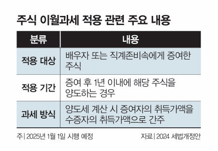 다만 내년 1월 1일 시행 예정인 ‘2024 세법개정안’에는 주식 증여에 대한 이월과세 규정이 포함돼 주의가 필요하다(표 참조). 내년부터는 증여 시점으로부터 1년 이내에 해당 주식을 양도할 경우 증여자의 최초 취득가액을 수증자(증여를 받는 사람)의 취득가액으로 간주한다. 따라서 현재 수익을 내고 있는 주식을 단기간에 현금화해야 한다면 올 연말까지 증여를 마치는 것이 좋다. 이와 관련해 안수남 세무법인 다솔 대표는 “증여만 해두면 매도는 내년에 해도 법의 소급 적용을 받지 않을 것”이라면서 “앞으로는 1년 전부터 주식 처분 계획을 세우고 움직여야 절세 효과를 누릴 수 있다”고 조언했다.