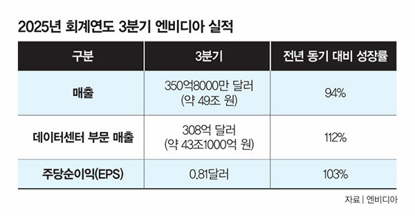 엔비디아는 11월 20일(현지 시간) 또 한 번 ‘어닝서프라이즈’ 소식을 알렸다(표 참조). 3분기 매출 350억8000만 달러(약 49조 원), 주당순이익(EPS) 0.81달러로 전년 동기 대비 94% 매출 성장률을 기록한 것이다. 이는 월가에서 전망한 매출 331억6000만 달러(약 46조4000억 원), EPS 0.75달러를 큰 폭으로 뛰어넘는 수치다(시장조사업체 LSEG 집계 기준).