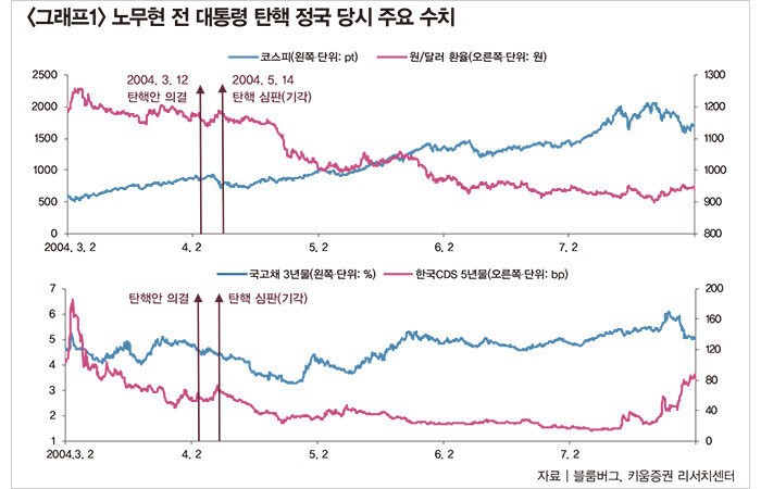 2004년 3월 12일 국회는 당시 노무현 대통령이 선거중립의무를 위반했다는 이유로 탄핵소추안을 가결했다. 탄핵소추안 가결로 정치적 불확실성이 높아지면서 금융시장은 단기적으로 충격을 받았다(그래프1 참조). 하지만 그해 5월 14일 헌법재판소가 탄핵소추안을 기각 결정하자 상황이 반전됐다. 기각 결정 당일과 그다음 거래일에 코스피가 각각 2.7%, 5.1% 하락했지만 이후 반등하기 시작한 것이다. 원/달러 환율 역시 탄핵소추안 기각 결정 당일 1186원으로 하락 전환했고, 그해 6월 1155원까지 떨어졌다. 국고채 3년물 금리 역시 마찬가지였다.