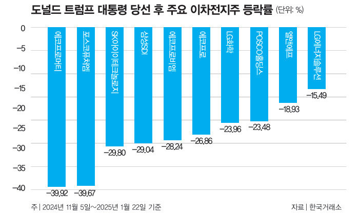 사실 국내 배터리 업계는 지난해 11월 트럼프 대통령 당선 이후 3개월째 주가 하락세가 이어지고 있다. 미국 대선이 치러지기 전날인 11월 5일부터 트럼프 대통령 취임식 이후인 1월 22일까지 에코프로머티(-39.92%)와 포스코퓨처엠(-39.67%)은 주가가 40% 가까이 빠진 상태다(그래프 참조). 그 뒤를 SK아이이테크놀로지(-29.80%), 삼성SDI(-29.04%), 에코프로비엠(-28.24%), 에코프로(-26.86%), LG화학(-23.96%), POSCO홀딩스(-23.48%), 엘앤에프(-18.93%), LG에너지솔루션(-15.49%) 등이 이었다.
