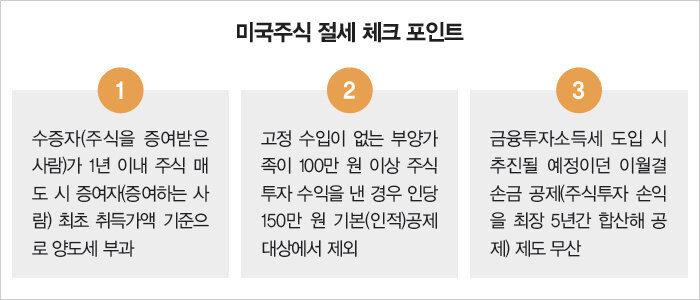 국내 주식과 미국주식 투자의 차이점 중 하나는 ‘양도소득세 부과 여부’다. 대주주 등을 제외하고는 주식 양도소득이 발생해도 별도의 세금을 내지 않는 국내 주식과 달리, 미국주식에는 고율 양도세(22%)가 부과된다. 그간 이 세금을 피해 가는 가장 좋은 방법은 배우자 등 가족 증여였다. 증여 시 주식 취득가액이 증여 시점 전후 2개월(총 4개월) 평균으로 계산돼 양도세가 대폭 줄고, 배우자는 10년간 6억 원, 성인 자녀는 5000만 원 한도로 증여세가 면제되는 점을 이용한 것이다.