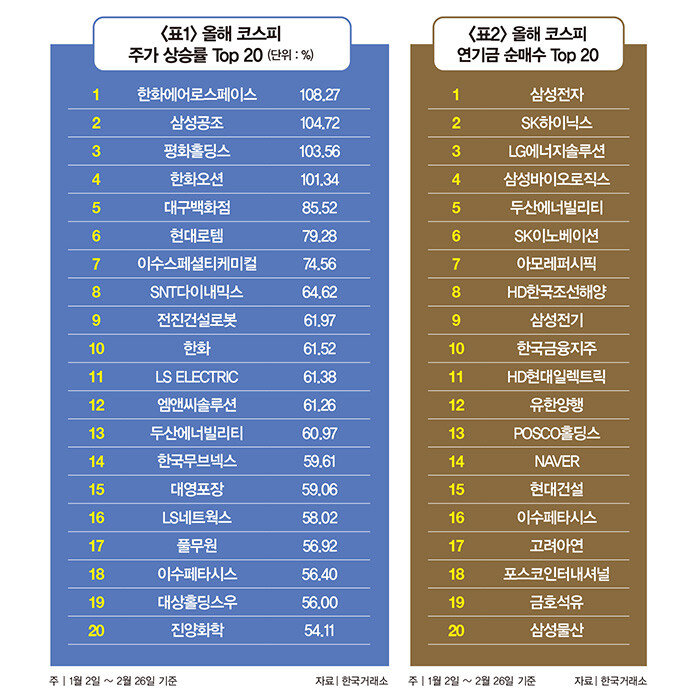 올해 들어 코스피를 이끈 종목은 무엇일까. 1월 2일∼2월 26일 주가 상승률 상위 20위권에는 1위 한화에어로스페이스를 필두로 한화오션, 현대로템, SNT다이내믹스, 엠앤씨솔루션 등 방산 관련주 5개가 이름을 올렸다(표1 참조). 여기에 이 시기 주가 상승률 2위를 기록한 삼성공조를 비롯해 LS ELECTRIC, LS네트웍스, 이수페타시스 등 AI 산업 공급망과 관련된 종목도 눈에 띈다. 이 밖에도 이차전지 관련주인 황화리튬(고체전해질 원료) 생산업체 이수스페셜티케미컬, ‘우크라이나 재건주’로 불리는 전진건설로봇, 원전주 두산에너빌리티 등도 주가 상승폭을 키웠다. 이른바 ‘대선 테마주’로 분류되는 평화홀딩스, 대영포장, 대상홀딩스우, 진양화학 등 종목도 주가 상승률 상위권에 올랐다.