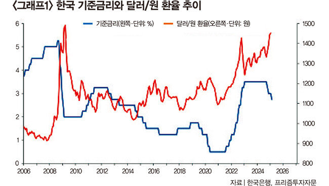 한국 기준금리와 달러에 대한 원화 환율의 관계를 살펴보면 2021~2022년을 제외하고는 외환시장이 불안할 때마다 금리인하가 단행된 것을 발견할 수 있다(그래프1 참조). 예를 들어 2008~2009년 금리인하 국면에는 글로벌 금융위기로 달러에 대한 원화 환율이 1570원까지 치솟았고, 2011~2012년에는 유럽 재정위기 공포가 부각되며 환율 변동성이 커진 바 있다. 특히 2019~2020년 금리인하 국면은 코로나19 팬데믹으로 금융시장이 충격에 빠진 때였다.
