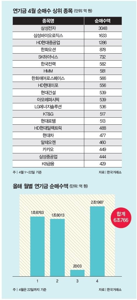 최근 국내 증시에서 대규모 순매수를 기록하고 있는 연기금을 두고 온라인 투자 커뮤니티 이용자들이 나눈 의견이다. 한국거래소에 따르면 연기금은 올해 들어 6조 원 넘는 매수세를 나타냈다. 특히 4월에는 한 달이 채 되기도 전(1~22일)에 2조1987억 원어치를 순매수했다(그래프 참조). ‘트럼프발(發) 관세전쟁’에 증시가 폭락하자 ‘낙폭 과대’로 판단하고 저가 매수에 나선 것이다. 연기금의 대부분을 차지하는 국민연금공단은 지난해 15%로 역대 최고 수준의 운용수익률을 거뒀다. 이에 증시가 하락할 때 연기금이 담은 종목들에 이목이 쏠리고 있다.