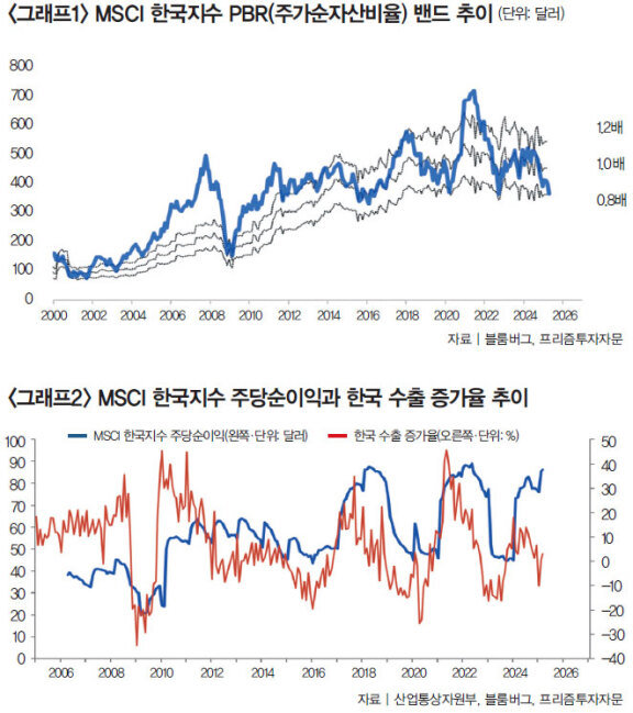 일반적으로 투자자는 주식 가격이 폭락할 때 주가수익비율(Price to Earning Ratio·PER)을 보곤 한다. 그러나 한국에서는 PER 지표를 투자에 활용하기가 어렵다. 한국 기업의 이익 전망은 수출 경기 변동에 따라 오르락내리락하는 경향이 있기 때문이다(그래프2 참조). 한국 상장기업 대부분이 수출기업인 데다, 한국 수출이 글로벌 경기 변동의 영향을 크게 받는 것이 원인이다.문제는 앞으로도 이런 현상이 시정되기 어렵다는 데 있다. 반도체와 철강, 조선, 화학 등 한국의 주력 수출산업 대부분이 대규모 투자를 필요로 하는 장치산업인 만큼 글로벌 수요 변화에 신속하게 대응해 생산량을 조정하기가 힘들기 때문이다.