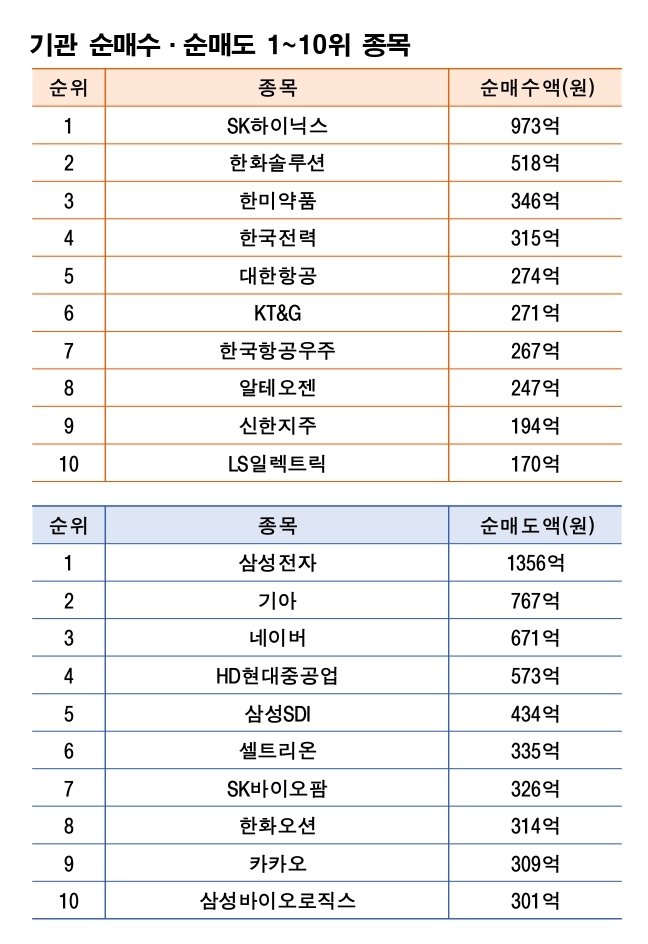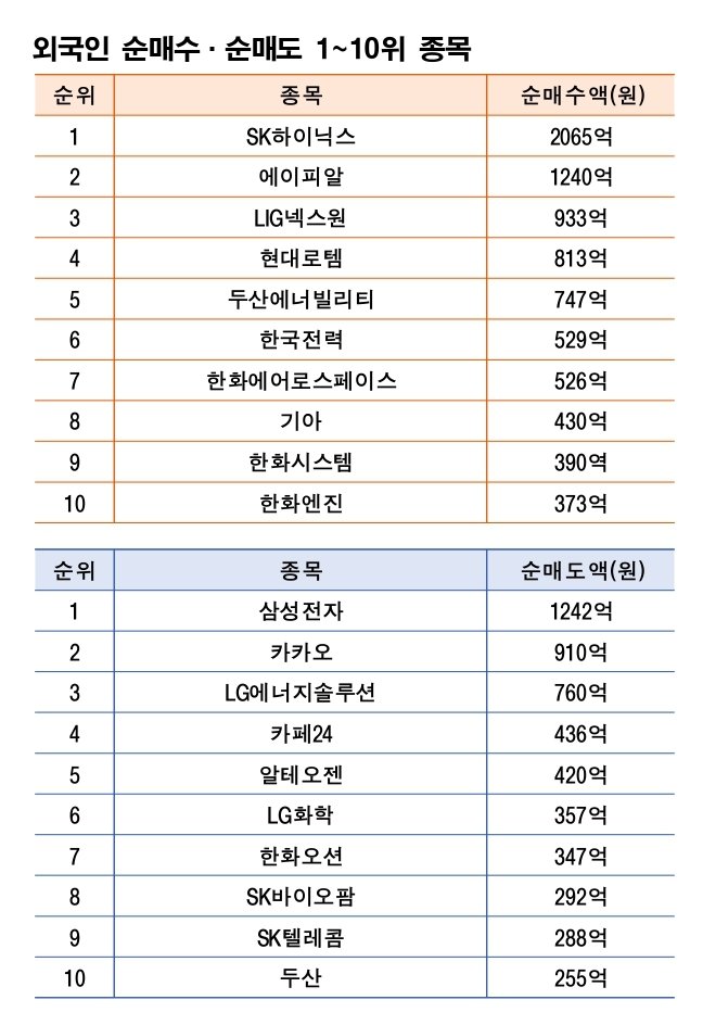 5월 9일 한국거래소에 따르면 5월 7~9일 외국인이 가장 많이 매수한 종목은 SK하이닉스로 집계됐다(오후 3시 45분 기준). 2~10위는 에이피알, LIG넥스원, 현대로템, 두산에너빌리티, 한국전력, 한화에어로스페이스, 기아, 한화시스템, 한화엔진이었다. 외국인의 순매도 상위 10개 종목은 삼성전자, 카카오, LG에너지솔루션, 카페24, 알테오젠, LG화학, 한화오션, SK바이오팜, SK텔레콤, 두산 순이었다.