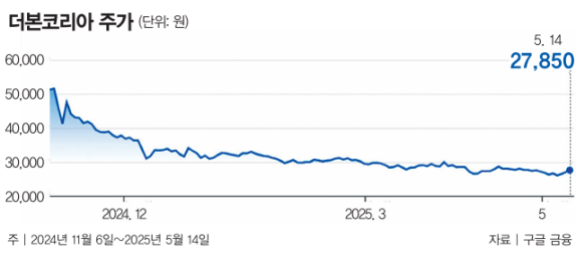 지난해 11월 6일 코스피에 상장돼 당일 장중 6만4500원까지 올랐던 더본코리아 주가가 2만 원대까지 급락한 후 좀처럼 반등 기미가 보이지 않고 있다(그래프 참조). 5월 14일 종가 기준 더본코리아 주가는 2만7850원으로 공모가(3만4000원) 대비 18.09%(6150원) 떨어졌다.