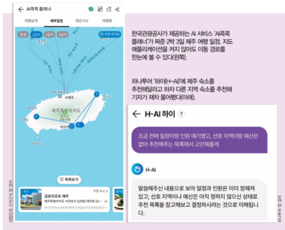 한국관광공사가 운영하는 국내 여행 정보 플랫폼 ‘대한민국 구석구석’의 인공지능(AI) 챗봇 ‘AI콕콕 플래너’에 제주 3박 4일 여행 일정을 짜달라고 부탁했다. 애플리케이션(앱)에 여행지와 기간 등 몇 가지 정보를 입력하니 5초 만에 시간대별 일정표가 뚝딱 완성됐다. 카페부터 맛집, 명소까지 빠짐없이 정리돼 있었다. 성격유형지표에서 ‘파워 J(계획형)’에 해당하는 기자도 “일정은 이대로 하고 숙소랑 항공편만 예약해 바로 떠나볼까” 싶은 마음이 들 정도로 꽤 정교한 일정표였다.