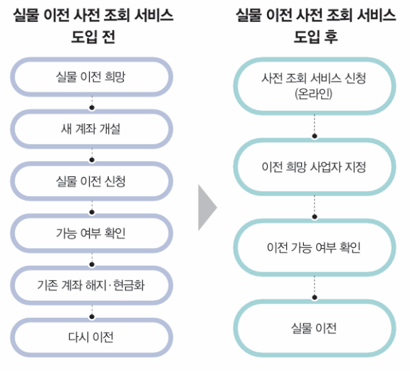 새롭게 도입된 사전 조회 서비스는 실물 이전 불편을 줄이고자 마련됐다. 기존에는 이전하려는 퇴직연금사업자에 계좌를 먼저 개설하고, 실물 이전을 신청한 후에야 이전 가능 여부를 확인할 수 있었다(인포그래픽 참조). 만약 보유한 상품이 실물 이전 대상이 아니라면 신청을 취소하거나 갖고 있는 상품을 해지해야 했다. 새 계좌로 옮긴 후 다시 상품을 골라서 포트폴리오를 짜야 해 번거롭기도 했다.하지만 7월 21일부터는 퇴직연금사업자 홈페이지나 모바일 애플리케이션(앱)에서 퇴직연금 실물 이전 사전 조회를 신청하면 해당 금융사가 실물 이전 대상 회사들에 가능 여부를 확인하고, 영업일 기준 하루이틀 안에 결과를 알려준다. 온라인으로만 사전 조회 신청이 가능하며, 영업점 방문 등 오프라인으로는 불가능하다.