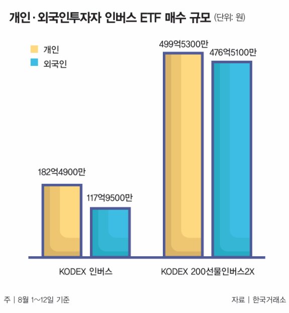 이 가운데 투자자들의 눈이 향하는 곳은 코스피 하락에 베팅하는 인버스 ETF다. 개인투자자는 8월 1~12일 대표적인 인버스 ETF인 KODEX 인버스와 KODEX 200선물인버스2X를 각각 182억4900만 원, 499억5300만 원 순매수했다(그래프 참조). 외국인투자자도 두 상품을 117억9500만 원, 476억5100만 원씩 사들였다. 특히 강한 매수세가 나타난 KODEX 200선물인버스2X는 코스피200 선물 지수를 2배로 역추종하는 고위험 상품이다. 투자자 사이에서 이른바 ‘곱버스’로 통한다.