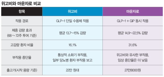효과 차이는 약물 작용 경로에서 비롯된다. 위고비는 GLP-1 호르몬을 모방한 세마글루티드 성분으로 식욕을 억제한다. 마운자로는 GLP-1에 더해 GIP 수용체까지 활성화한다. 식욕 억제와 혈당 개선을 동시에 노리기 때문에 대사질환이나 당뇨 병력이 있는 환자에게 유리할 수 있다. 위고비는 2형 당뇨 환자에게서 구토·메스꺼움 등 부작용 보고가 있었다. 두 약물 모두 메스꺼움·설사 등 소화기 증상이 흔하지만, 임상에서는 마운자로의 치료 중단율이 더 낮았다.마운자로의 시작 용량 2.5㎎(4주분) 출고가는 27만8000원으로 책정됐다. 위고비 시작 용량 출고가는 약 37만 원이었지만, 마운자로가 더 저렴하자 노보노디스크는 가격 인하로 맞섰다. 위고비 출하 가격을 용량별로 조정해 시작 용량 0.25㎎을 22만 원대로 낮췄다. 다만 두 약물 모두 국민건강보험이 적용되지 않아 병원별 실제 판매가는 차이가 있다. 위고비는 현재 한 달 기준 40만~70만 원 선에서 처방된다.
