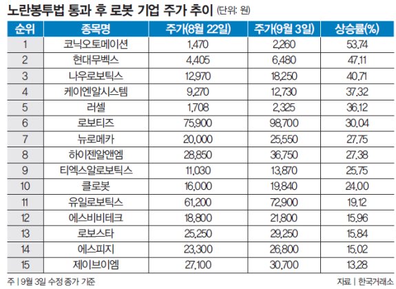 이처럼 노란봉투법 통과 후 주가 상승률이 두 자릿수를 기록한 기업이 수두룩하다. 하지만 로봇산업의 미래 성장성을 인정하면서도 기업별 주가 차별화 및 대내외 환경에 따른 투자에는 유의가 필요하다는 지적도 나온다.