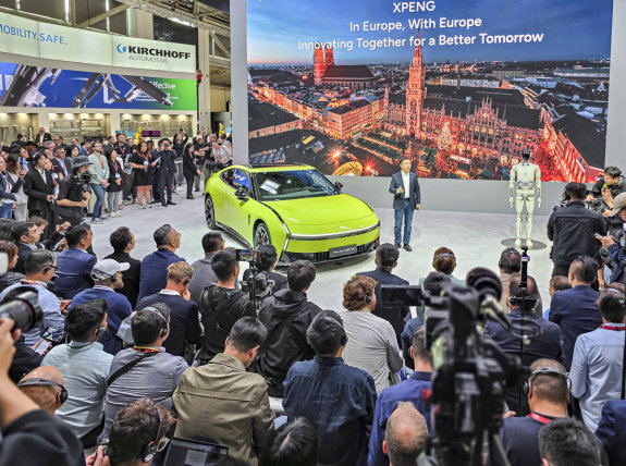 9월 8일(현지시간) 독일 뮌헨에서 열린 ‘IAA 모빌리티 2025’에서 중국 전기차업체 샤오펑의 허샤오펑 회장이 차량을 소개하고 있다. 뉴스1