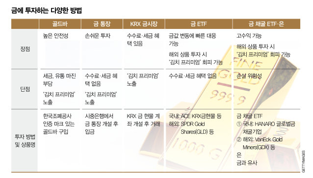 금에 투자하는 대표적인 방법으로는 ‘골드바’가 있다. 한국조폐공사, 시중은행, 한국금거래소, 귀금속 상가·도매상 등에서 한국조폐공사 인증 마크가 있는 골드바를 구입하면 된다. 실물인 골드바 구매는 국가 및 금융 리스크와 분리돼 있다는 점에서 가장 안전한 금 투자 방식이다. 다만 다른 투자법에 비해 가격 메리트가 크지 않다. 골드바 구매 시에는 부가가치세 10%와 제조·유통 마진 등을 부담해야 하기 때문이다. 즉 금값이 골드바 구입 당시보다 10% 이상 올라야 본전이 된다. 또 대량 구매 시 금고, 보험 등 보관·도난 관련 비용이 추가로 발생한다.실물 금을 직접 보유하지 않으면서 투자할 수 있는 방법은 ‘금 통장’ 또는 ‘한국거래소(KRX) 금시장’을 활용하는 것이다. 금 통장은 시중은행에서 손쉽게 개설 가능하다. 일반 입출금 통장처럼 g당 금 시세에 해당하는 돈을 입금하면 금을 모을 수 있다. 직관적 방식이라 초보 투자자에게 적합하다. 금 통장에서 한 발 나아가 수수료·세금 효율까지 따진다면 KRX 금시장이 좋은 선택지다. 증권사에서 ‘KRX 금 현물 계좌’를 개설한 뒤 주식 거래하듯이 매수·매도 주문을 넣으면 된다. 수수료가 거래금액의 0.2~0.5% 내외로 저렴하고 부가가치세, 배당소득세, 양도소득세 등이 모두 면제다. 금 통장의 경우 수수료가 약 1%이며 매매차익에는 15.4% 배당소득세가 붙는다. 금 통장과 KRX 금시장 모두 금 실물 인출 시 10% 부가가치세 과세 대상이다.
