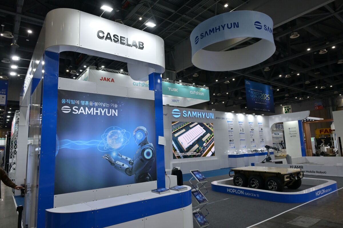 모션 컨트롤 기업 삼현이 11월 5일 경기 일산 킨텍스에서 열린 ‘2025 로보월드’ 행사장에 설치한 부스. 삼현 제공
