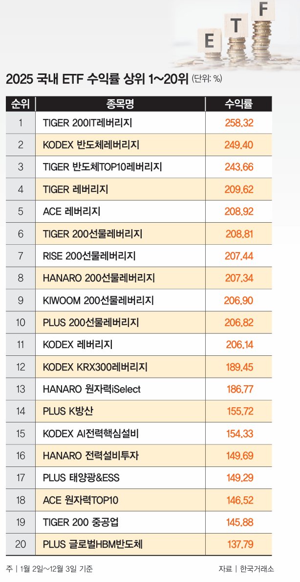 한국거래소에 따르면 올해(1월 2일~12월 3일) 국내 ETF 수익률 상위 10위권은 코스피, 반도체, 코스피 선물 레버리지가 전부 차지했다(표 참조). 최고 수익률을 기록한 상품은 ‘TIGER 200IT레버리지’로, 258.32% 수익률을 올렸다. 이어 ‘KODEX 반도체레버리지’(249.40%), ‘TIGER 반도체TOP10레버리지’(243.66%), ‘TIGER 레버리지’(209.62%), ‘ACE 레버리지’(208.92%) 순으로 높은 수익률을 나타냈다. 증권사별 코스피200 선물 레버리지 상품도 모두 200% 넘는 수익을 기록했다.