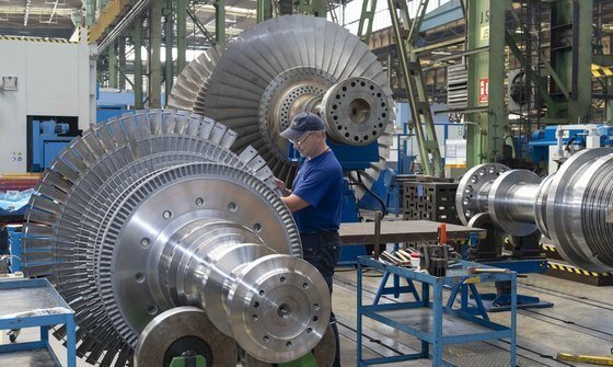 체코 플젠에 위치한 두산스코다파워 공장에서 직원이 증기터빈을 살펴보고 있다. 두산에너빌리티 제공
