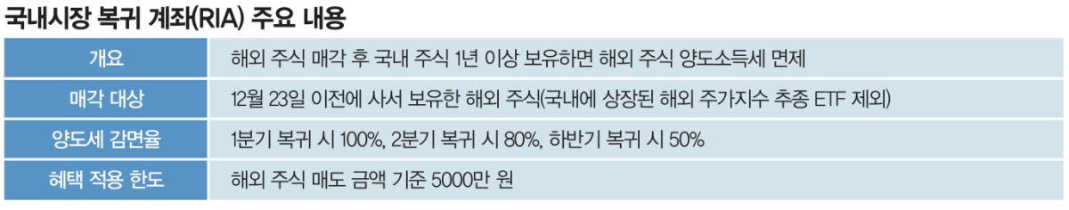 지난해 12월 29일 주식 온라인 커뮤니티에 올라온 게시 글이다. 정부는 지난해 원/달러 환율 안정과 주식시장 활성화를 위해 RIA 제도를 신설하기로 했다. RIA에서 해외 주식을 팔고 국내 주식을 사면 해외 주식 매도로 얻은 시세차익에 붙는 양도소득세를 면제해주는 것이다(표 참조). 서학개미들은 RIA 세제 혜택을 키울 방법을 고심하고 있다.