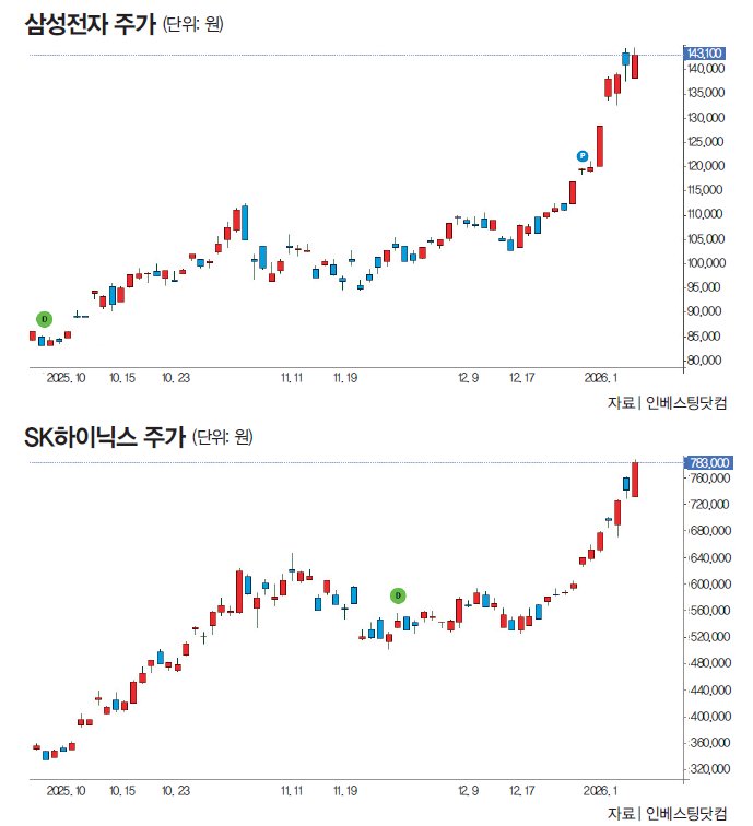 코스피도 새해 들어 가파른 랠리를 보였다. 지난해 12월 30일부터 3거래일 만에 300포인트 가까이 오르며 4500 선을 돌파했고, 1월 8일 4600 선을 터치했다. 지수 상승폭의 상당 부분은 반도체 대형주인 삼성전자와 SK하이닉스가 이끌었다. 1월 5일 시가총액 1위 삼성전자가 하루 만에 7.47% 급등하자, 코스피는 4300 선을 돌파한 지 하루 만에 4450 선까지 치솟았다. 하루 상승폭으로는 도널드 트럼프 행정부의 상호관세 유예 소식에 증시가 급등했던 지난해 4월 10일에 이어 사상 두 번째로 컸다. 대신증권에 따르면 이날 삼성전자는 코스피 상승분 가운데 60포인트 이상을 끌어올린 것으로 분석됐다.이 같은 주가 강세 배경에는 글로벌 메모리 반도체 공급 부족이 자리하고 있다. 인공지능(AI) 데이터센터 수요가 급증하면서 AI 학습·추론용 고대역폭메모리(HBM)와 서버용 D램 수요가 빠르게 늘고 있지만, 공장 증설에는 2~3년이 걸려 단기간 내 공급 확대가 쉽지 않기 때문이다. 업계에 따르면 마이크로소프트(MS)와 구글 등 글로벌 빅테크의 구매 담당 임원들이 반도체 물량을 확보하고자 한국을 찾아 협상을 벌이고 있는 것으로 전해진다.