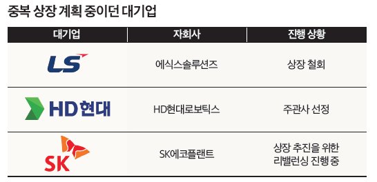LS의 상장 철회 결정으로 중복 상장을 계획 중인 다른 기업들도 영향이 불가피해졌다. HD현대 자회사인 HD현대로보틱스(지분 81.8%)와 SK가 보유한 SK에코플랜트(63.2%)가 대표적이다(표 참조). 소액주주 권리 침해 지적에도 이들 기업이 중복 상장을 하려는 데는 현실적인 이유도 있다. 고금리와 경기 불황으로 회사채 발행 등 외부 차입이 부담스러운 상황에서 상장이 대안으로 여겨지기 때문이다. 또 중복 상장은 신사업 확장을 위한 핵심 자금 조달 창구 역할을 해왔다. HD현대로보틱스는 피지컬 AI(인공지능) 시대를 위한 선제적 투자 재원 확보 차원에서 상장을 추진하고 있다.업계에서는 중복 상장을 전면 금지하면 해외 상장을 검토하는 기업이 늘어날 수 있다는 우려도 제기된다. 증권업계 한 전문가는 “중복 상장의 원칙적 금지는 자본시장 정상화에 긍정적”이라면서도 “성장 산업 등 설비투자가 많이 필요한 기업에는 예외 규정을 적용하는 등 사안별로 자금 조달 문제를 어떻게 해결할지 고민할 필요가 있다”고 말했다.