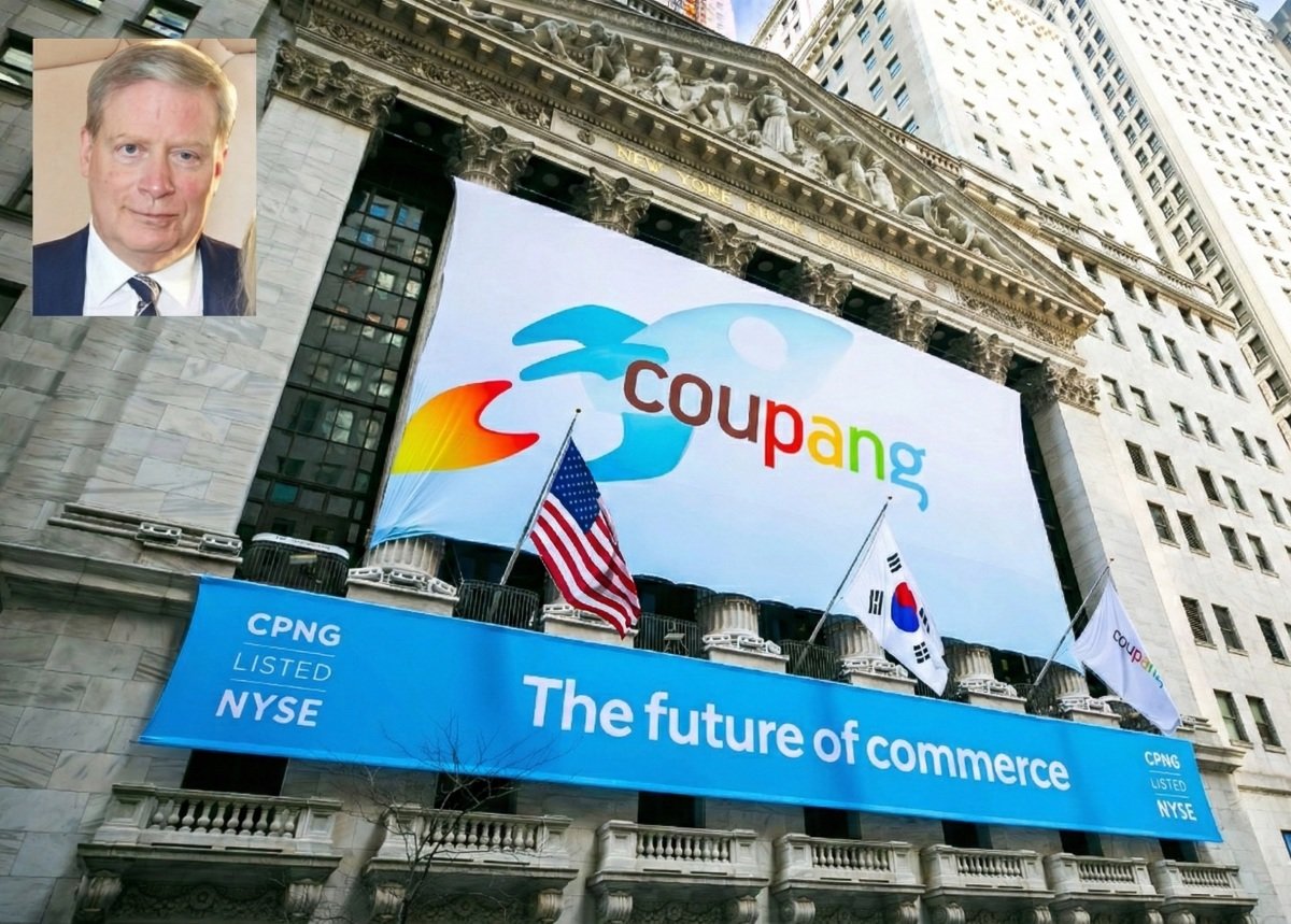 억만장자 투자자 스탠리 드러켄밀러(작은 사진)가 쿠팡에 대규모 투자를 해온 것으로 나타났다. 사진은 2021년 3월 11일(현지 시간) 쿠팡의 미국 뉴욕증권거래소(NYSE) 상장을 앞두고 거래소 외벽에 쿠팡 현수막이 걸려 있는 모습. 뉴시스