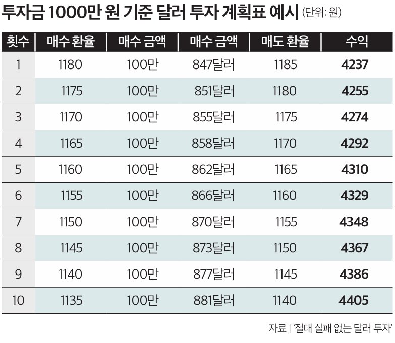 “정답에 가까운 공식이 있다(표 참조). 먼저 달러는 1180원, 엔화는 1020원 이하일 때 첫 매수를 시작한다. 총 투자금을 10회로 나눠 분할매수하고, 첫 매수 이후 환율이 5원 떨어질 때마다 한 번씩 추가로 산다. 이후 내가 산 가격보다 5원 오르면 해당 물량만 매도한다. 5원을 기준으로 삼은 이유는 최근 5년간 환율의 일평균 변동 폭을 고려한 값이기 때문이다.