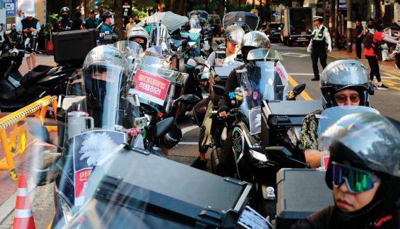 지난달 25일 오후 7시 서울의 한 왕복 8차선 교차로. 배달 노동자 A 씨는 배달의민족(배민) 배달 주문 3건을 받아 식당에서 음식을 모두 수거한 뒤 첫 번째 배송지로 이동하고 있었다. 오토바이를 몰고 직진하던 A 씨는 한번에 2…