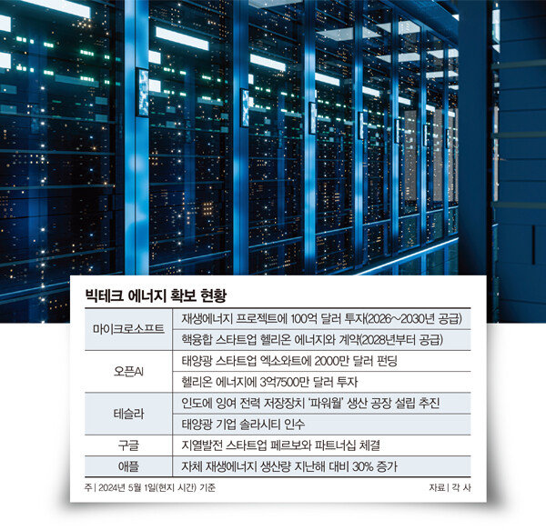 미국 빅테크가 재생에너지를 중심으로 한 에너지 확보 총력전에 나섰다(표 참조). 생성형 인공지능(AI) 개발엔 대용량 전력이 필요하고 개발 경쟁이 가속화할수록 그 규모가 더 늘어나는데, 현 전력 공급망으론 증가하는 미래 전력 수요를…