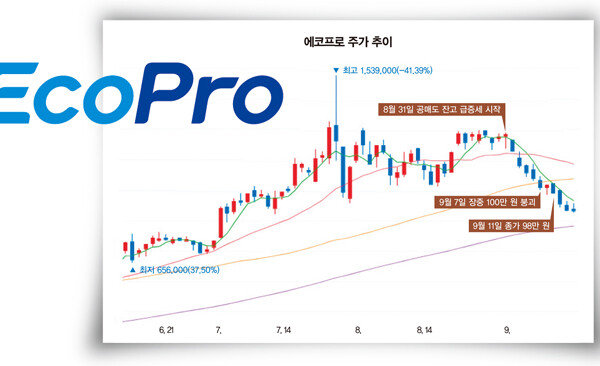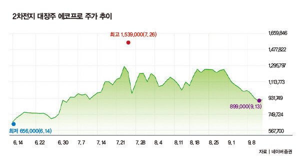 국내 2차전지 관련주가 일제히 동반 약세를 보이고 있다. 2차전지 대장주 에코프로는 9월 11일 황제주(주당 100만 원 넘는 주식) 자리를 반납한 데 이어 13일 90만 원 선도 무너지며 89만9000원으로 하락 마감했다(그래프 …