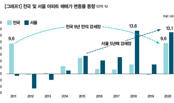 지난해 전국 집값은 9.6% 상승을 기록했다(그래프1 참조). 9년 만의 전국 강세장이 그리 달갑지 않다. 이유는 지난해 13.1% 폭등한 서울 집값 때문이다. 급상승한 지난해 서울 부동산의 뒤에는 11년 만에 한국 부채 수준에 빨…