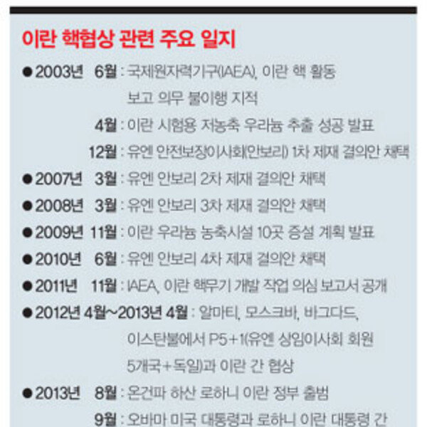 “아무래도 힘들겠다.”11월 20일부터 스위스 제네바에서 열린 이란과 P5+1(유엔 상임이사회 회원 5개국+독일) 간 이란 핵협상. 협상 둘째 날인 21일 저녁 회의장인 인터콘티넨털 호텔 부근 레스토랑에 모인 미국 대표단 입에서는 …
