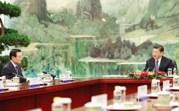 문재인 대통령의 특사로 방중한 이해찬 전 국무총리(왼쪽)가 5월 19일 중국 베이징 인민대회당에서 시진핑 국가주석과 만나고 있다. 한국특사단을 시 주석의 아랫자리에 앉힌 것을 두고 의도된 ‘의전 결례’라는 목소리가 높다.[뉴시스]새…