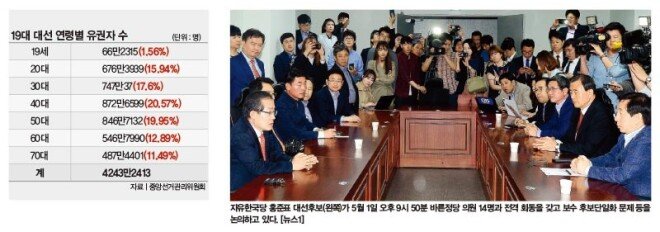 유권자 수가 1000만 명을 넘어선 이번 대선에서 60대 이상 고연령층이 얼마나 투표에 참여하느냐에 따라 당선인 윤곽이 달라질 수 있는 것이다. 5월 1일 엠브레인 여론조사에서 60대 이상 응답자는 홍준표 37.3%, 안철수 28.2%, 문재인 18.7% 순으로 지지했다. 중앙선거관리위원회가 4월 10일과 11일 실시한 유권자 투표 참여 의향 조사에서 60대 이상 고연령층 유권자는 60대 84.7%, 70대 이상 84%로 평균(82.8%)보다 더 높게 투표 참여 의사를 밝혔다.