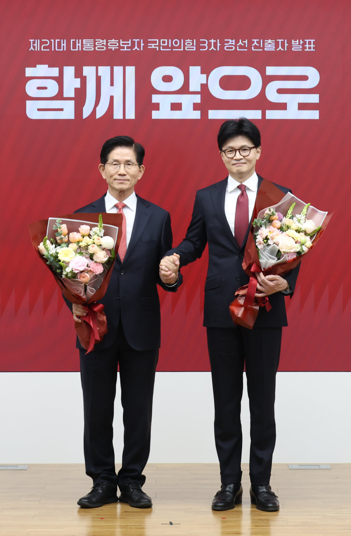 4월 29일 서울 여의도 국민의힘 당사에서 열린 제21대 대통령 후보자 국민의힘 3차 경선 진출자 발표 행사에서 3차 경선에 진출한 김문수 후보와 한동훈 후보가 기념촬영을 하고 있다. 뉴시스