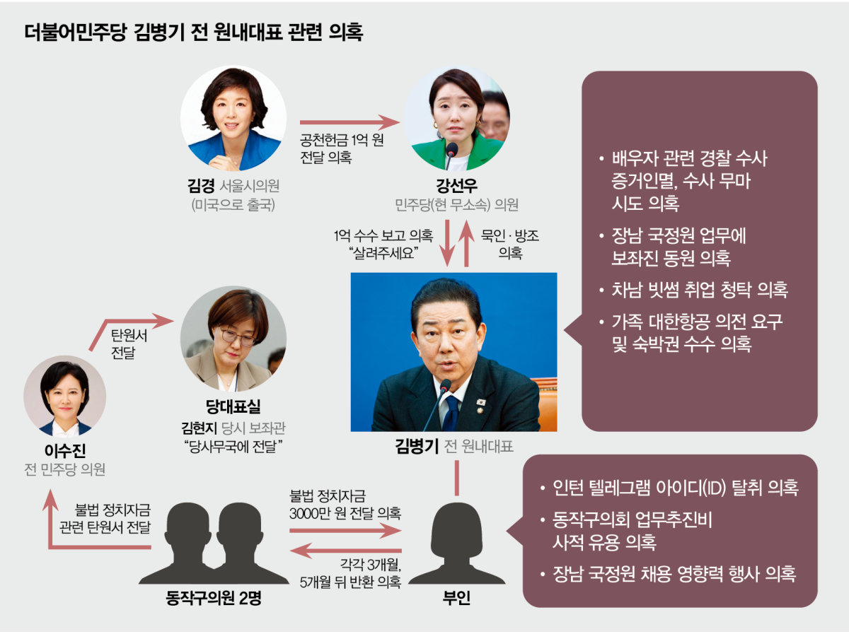 1월 1일에는 또 김 전 원내대표 측이 2020년 총선을 앞두고 불법 정치자금을 받았다는 내용의 탄원서가 공개됐다. 김 전 원내대표의 부인 이모 씨가 전직 동작구의원 2명으로부터 각각 현금 2000만 원과 1000만 원을 받았다가 돌려줬다는 내용이 담겼다. 김 전 원내대표는 “사실무근”이라는 입장이지만 민주당은 또 한 번 패닉에 빠졌다. 2022년 지방선거에 이어 김 전 원내대표와 관련된 탄원서에 언급된 2020년 총선, 2018년 지방선거 등으로까지 의혹이 퍼질 수 있기 때문이다.