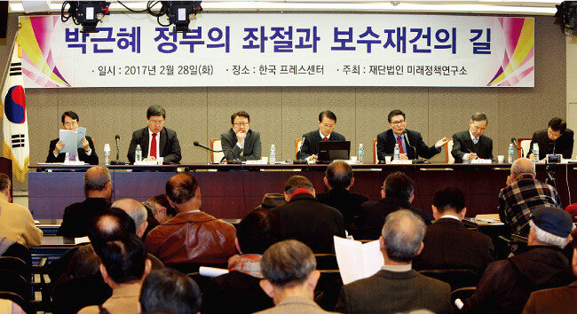 미래정책연구소(연구소·이사장 박범진)는 2월 28일 오후 2시 서울 중구 한국프레스센터 19층 기자회견장에서 ‘박근혜 정부의 좌절과 보수재건의 길’을 주제로 토론회를 개최했다. 연구소 측은 “대한민국 보수는 해방 후 좌우 이념 대립 속에서 대한민국을 건국하고, 6·25전쟁 때는 피 흘려 나라를 지켰으며, 가난을 딛고 오늘의 대한민국을 건설한 주역”이라면서 “하지만 최근 보수가 최순실 국정농단 사태로 위기에 빠진 만큼 철저한 자기성찰을 통해 시대가 요구하는 개혁적인 보수로 변해야 한다”고 토론회 개최 취지를 밝혔다.