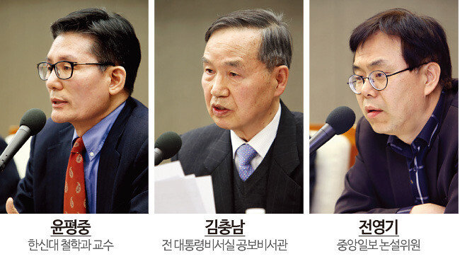 이날 토론회는 정치와 경제 분야로 나눠 윤평중 한신대 철학과 교수와 이종훈 명지대 경영학과 교수가 주제 발표를 하고 김충남 전 대통령비서실 공보2비서관, 전영기 중앙일보 논설위원, 오정근 건국대 특임교수, 정문건 전 서울시정개발연구원장이 토론자로 참여했다.먼저 ‘한국 보수주의의 미래는 있는가’라는 제목으로 발제한 윤평중 교수는 “건국과 산업화의 주역으로 자임해온 한국 보수가 왜 이렇게 궁박한 지경에 몰리게 됐을까”라는 질문부터 던지고 “보수의 총체적 위기는 보수가 자초한 것이라는 통절한 반성이 있어야 해법을 찾을 수 있을 것”이라고 말했다. 보수의 위기를 ‘바깥’이 아닌 보수 ‘안’에서 찾아야 한다는 뜻이다.