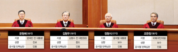 “위헌·위법이고 파면할 만큼 중대하다.”(정계선)“위헌·위법이나 중대하지 않다.”(문형배·이미선·김형두·정정미)“위헌·위법 요소를 인정할 수 없다.”(김복형)“의결정족수를 충족하지 못했다.”(정형식·조한창)헌법재판소가 3월 …