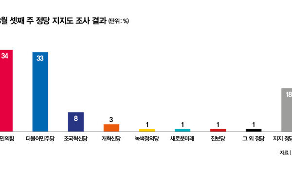 3월 둘째 주 국민의힘과 더불어민주당 정당 지지도가 지난주와 유사한 흐름을 보인 가운데 비례대표 정당 투표 의향 조사에서 조국혁신당이 존재감을 드러냈다. 윤석열 대통령 지지율은 2주 만에 하락해 36%를 기록했다.여론조사기관 한국갤…