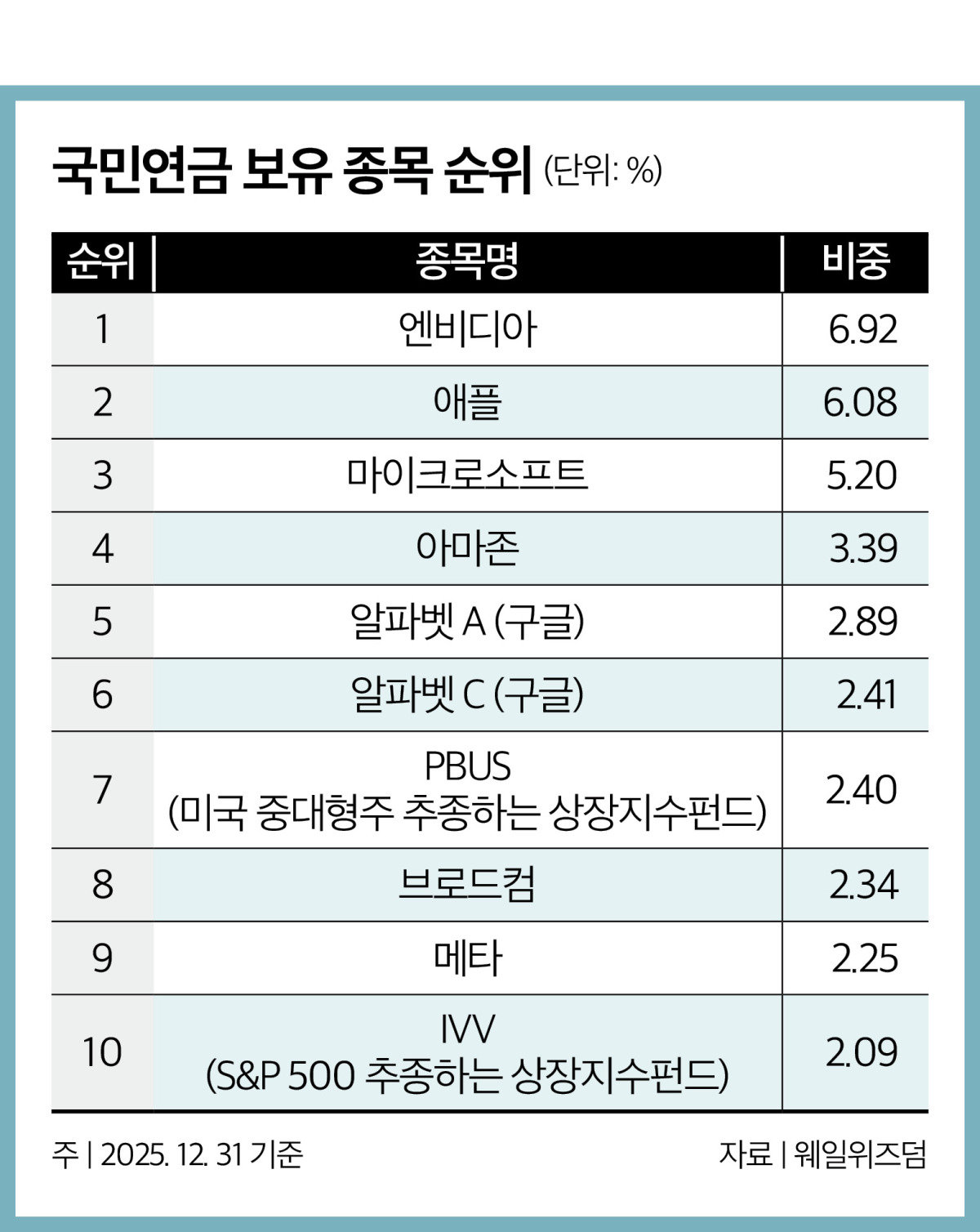 미국 주식 포트폴리오 내 비중 1위는 엔비디아(6.9%·93억4000만 달러)였다. 이어 애플(6.1%·82억1000만 달러), 알파벳(5.3%·71억6000만 달러), 아마존(3.4%·45억8000만 달러) 순이었다. AI 관련 기술주 중심 전략을 유지하면서 종목별로 비중을 조정하는 전술적 운용이 병행됐다.4분기 동안 평가액 증가 폭이 가장 컸던 종목은 알파벳이다. 지난해 9월 말 53억9000만 달러(7조8000억 원)에서 12월 말 71억6000만 달러(10조4000억 원)로 33% 급증했다. 보유 주식 수는 3%대 증가에 그쳤지만, 주가 상승이 평가액 확대를 이끌었다.