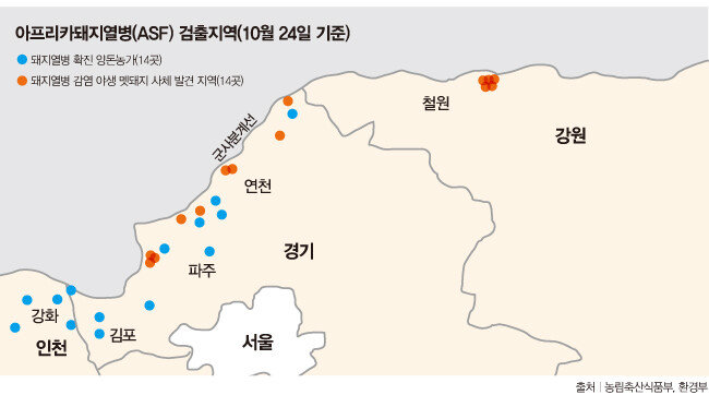 농가에서 키우는 집돼지의 돼지열병 확진이 더는 나오지 않고 있지만, 문제는 야생 멧돼지다. 산에서 발견된 멧돼지 사체에서 돼지열병 바이러스가 속속 검출되고 있기 때문이다. 첫 사례는 10월 2일 경기 연천 비무장지대(DMZ)에서 발견됐다. 이후 같은 연천과 경기 파주, 강원 철원의 DMZ 이남 민간인출입통제선(민통선) 지역을 중심으로 10월 24일까지 총 14마리의 야생 멧돼지가 돼지열병 바이러스에 감염된 사실이 확인됐다.북한과 접경지역인 민통선 인근에서 돼지열병 감염 사례가 집중 확인되자, 북한이 국내 돼지열병 유입의 진원지가 아니냐는 의심이 힘을 얻고 있다. 이미 북한은 이번 돼지열병 대란을 악화시킨 뇌관으로 지목되고 있다. 최근 세계동물보건기구(OIE)는 북한 당국에 돼지열병 발병 상황을 공개할 것을 촉구했다. 전염병에 대응하려면 국제기구 및 주변 국가와 정보를 공유하는 것이 절실하지만, 북한 측에서는 돼지열병에 관한 어떤 정보도 나오고 있지 않다. 북한은 5월 30일 자강도 우시군 내 양돈시설에서 돼지열병이 발생했다고 OIE에 보고한 이후 5개월간 아무런 후속 보고를 하지 않고 있다.