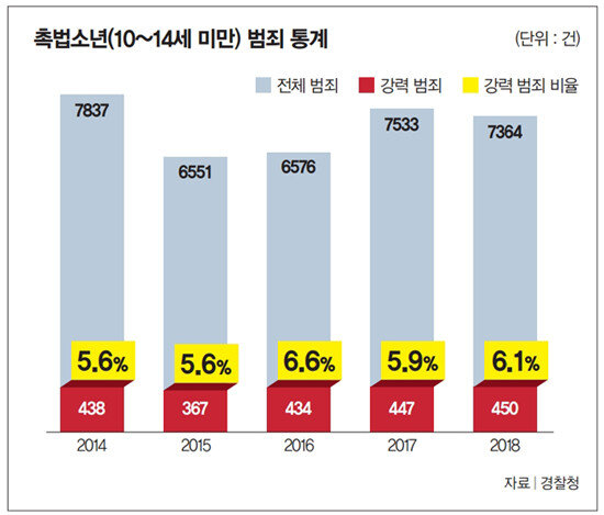 경찰청에 따르면 지난해 범법 행위로 법원 소년부에 송치된 촉법소년은 7364건이다. 2017년 7533건(강력범죄 447건)보다 전체 건수는 줄어든 가운데 살인·강도·강간·방화 등 강력범죄는 450건으로 소폭 늘어 최근 5년간 최대치를 기록했다(그래프 참조). 이보다 높은 연령의 범죄소년 검거 인원이 2017년 7만2752건에서 이듬해 6만6259건으로 10% 가까이 줄어들어 최근 5년 동안 가장 적었던 것과 대조된다. 범죄소년 중 강력범 수도 2014년 2630건에서 2018년 2272건으로 지속적으로 감소하고 있다. 성인 범죄자 검거 인원 역시 2015년 177만1390명에서 2018년 158만1922명으로 10%가량 줄어 4년 연속 감소세를 보였다. 반면 2016년 미성년자 범죄 중 12%였던 촉법소년 비중은 2018년 14%로 증가했다.