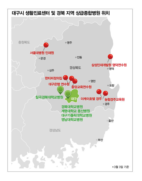 중대본에 따르면 코로나19 확진자의 80% 이상이 별 다른 증세가 없는 경증환자다. 앞으로 경증환자는 각 지방자치단체가 마련한 생활치료센터에서 생활하게 된다. 자택에서 자가격리하다 중증으로 심화돼 응급 상황이 발생하거나, 가족 및 지인에게 바이러스를 전파하는 것을 막기 위해서다. 중대본에 따르면 생활치료센터 입소자는 1인 1실에서 지내면서 매일 두 차례 체온 및 호흡기 증상을 자가 모니터링한다. 각 생활치료센터에는 의사 4명, 간호사 7명, 간호조무사 6명으로 구성된 17명의 의료진이 24시간 상주한다. 생활치료센터는 대구에 가장 먼저 도입되는데, 3월 3일 현재 대구시는 7개의 생활치료센터, 총 1029실을 확보했다(그림 참조).